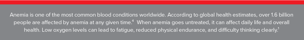 Anemia is a condition where your body does not have enough healthy red blood cells to carry oxygen to your tissues. Red blood cells contain hemoglobin, a protein that binds oxygen and delivers it throughout the body. When hemoglobin levels are low, organs and muscles don’t get the oxygen they need to work properly.¹ Anemia is not a disease itself—it is a sign that something else may be going on in the body.²